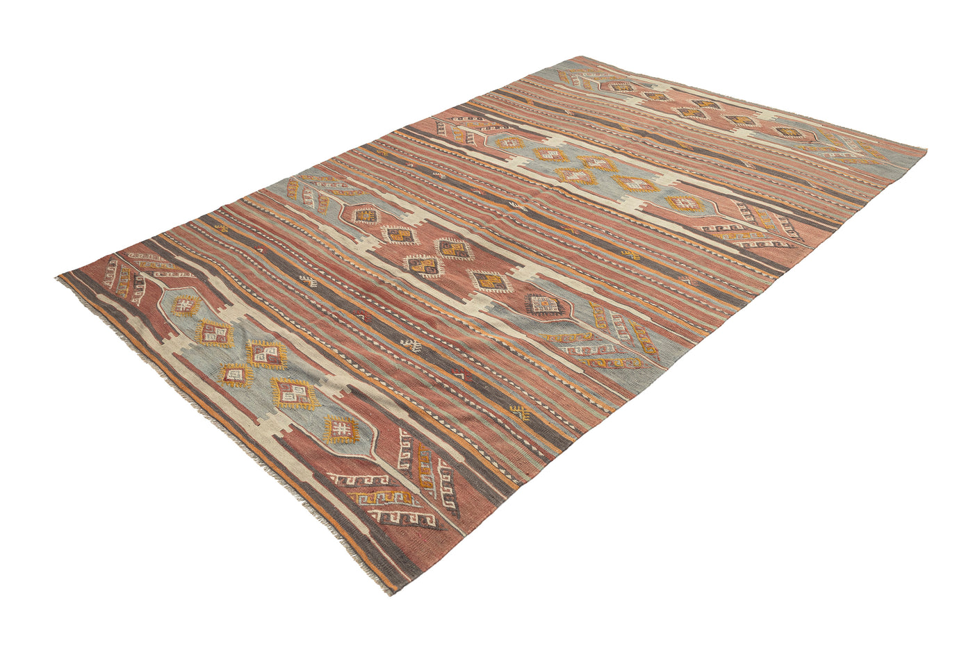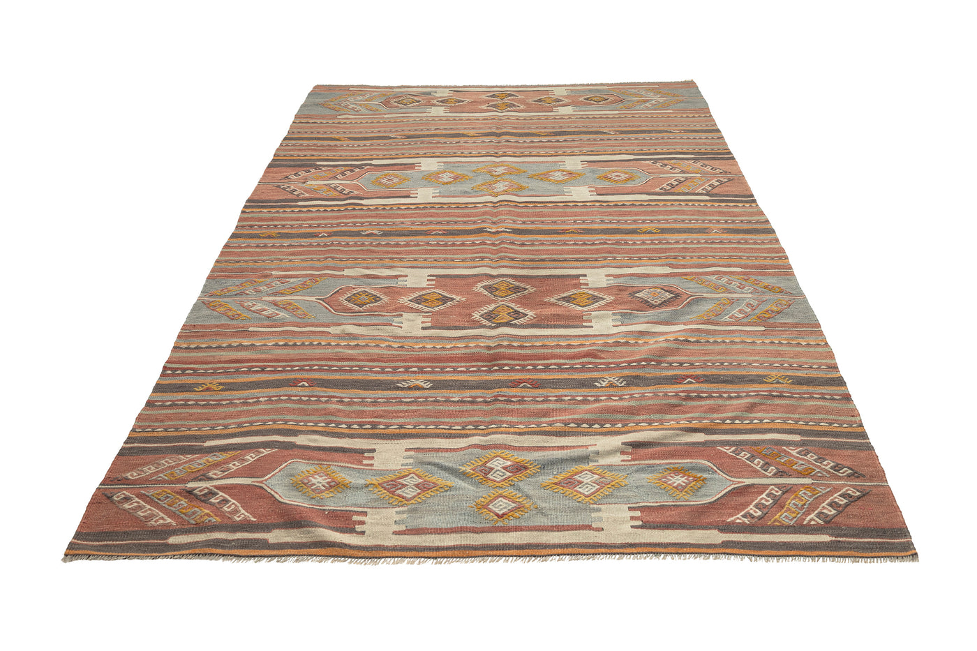 Turkish vintage kilims were made 100% wool on cotton or wool foundation by female artisans in Anatolian villages in the early and mid-20th Century.