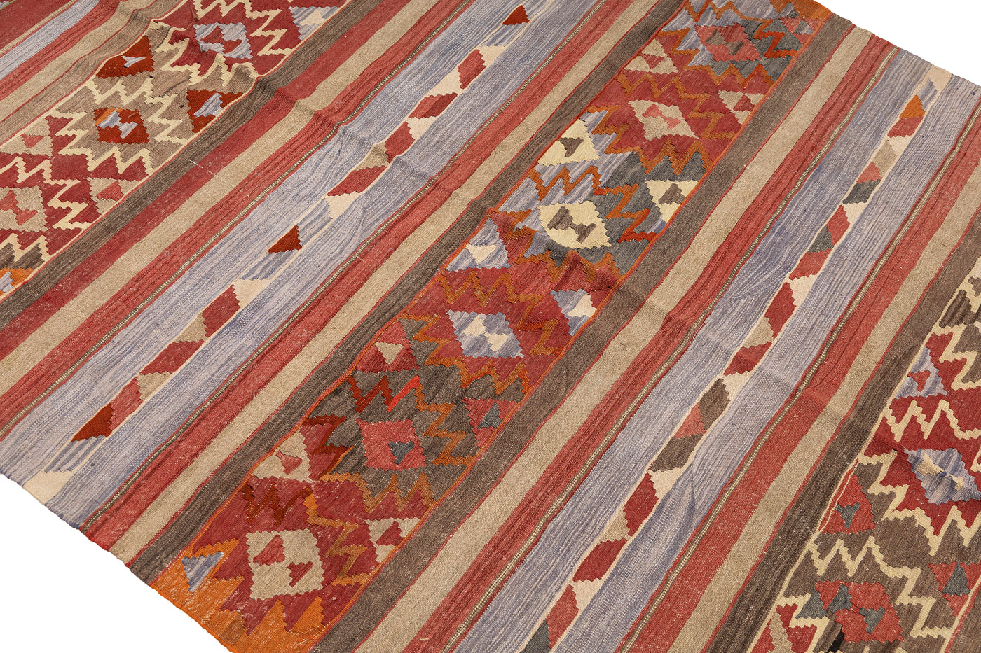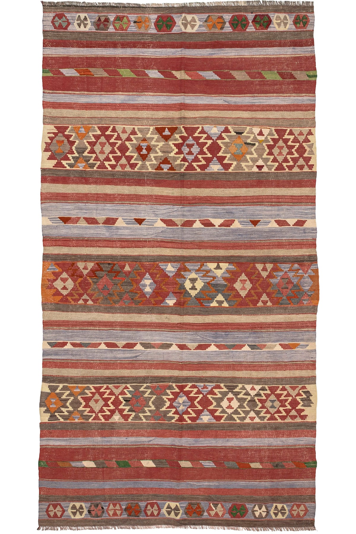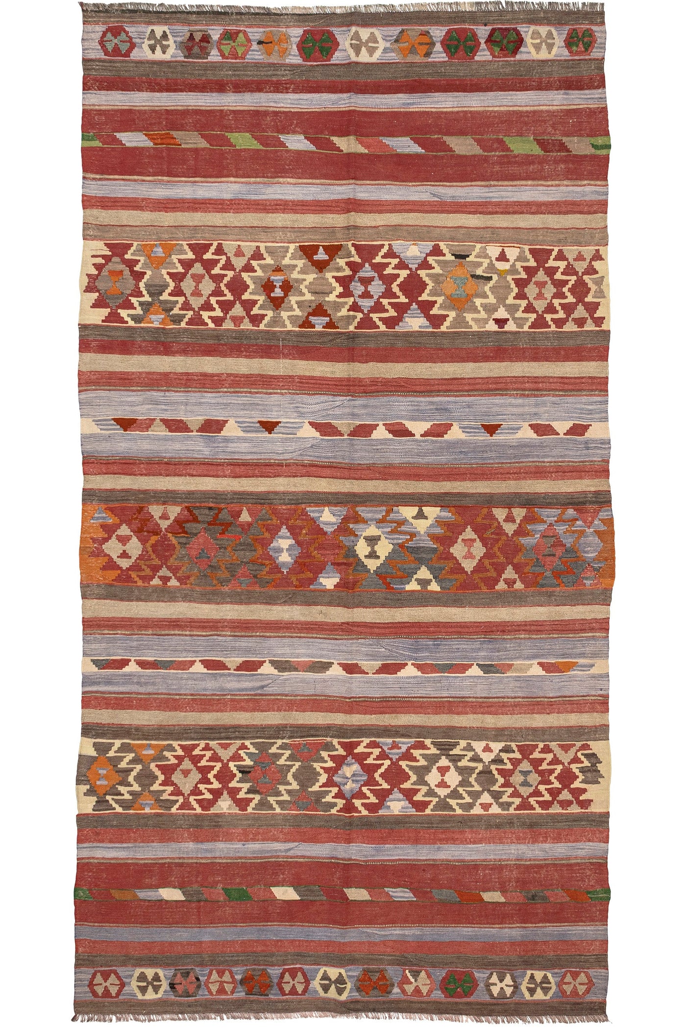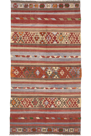 Turkish vintage kilims were made 100% wool on cotton or wool foundation by female artisans in Anatolian villages in the early and mid-20th Century.