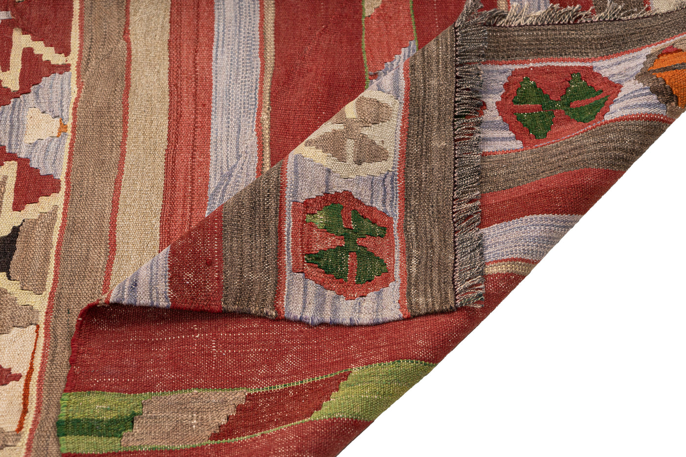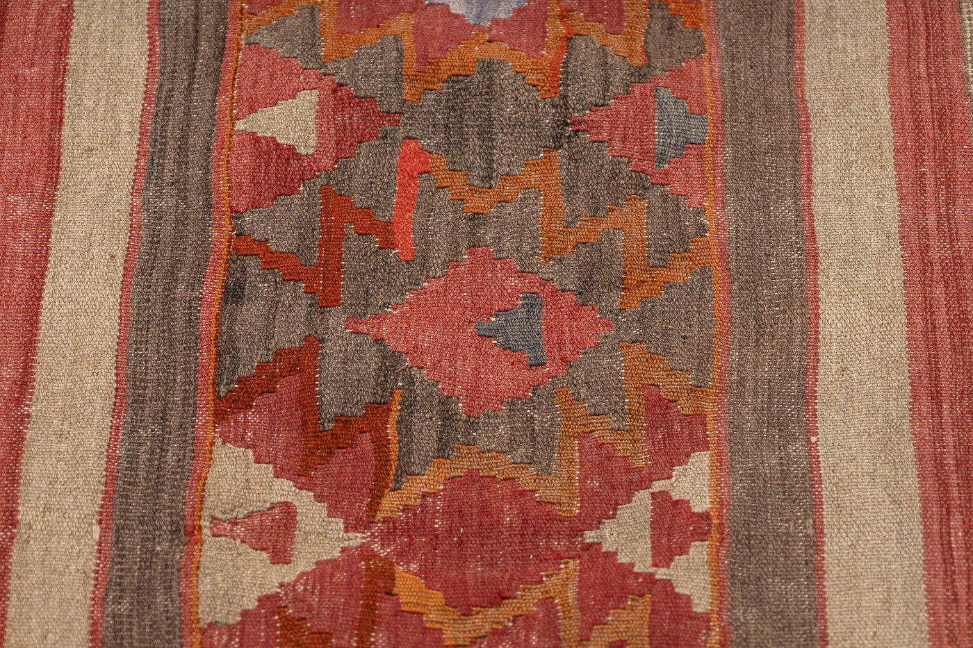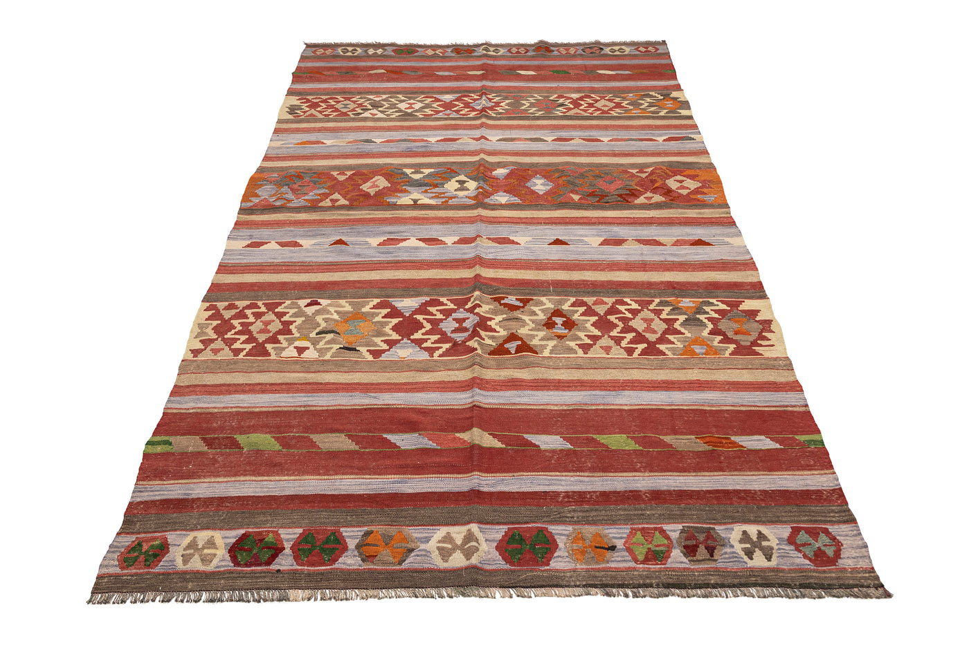 Turkish vintage kilims were made 100% wool on cotton or wool foundation by female artisans in Anatolian villages in the early and mid-20th Century.