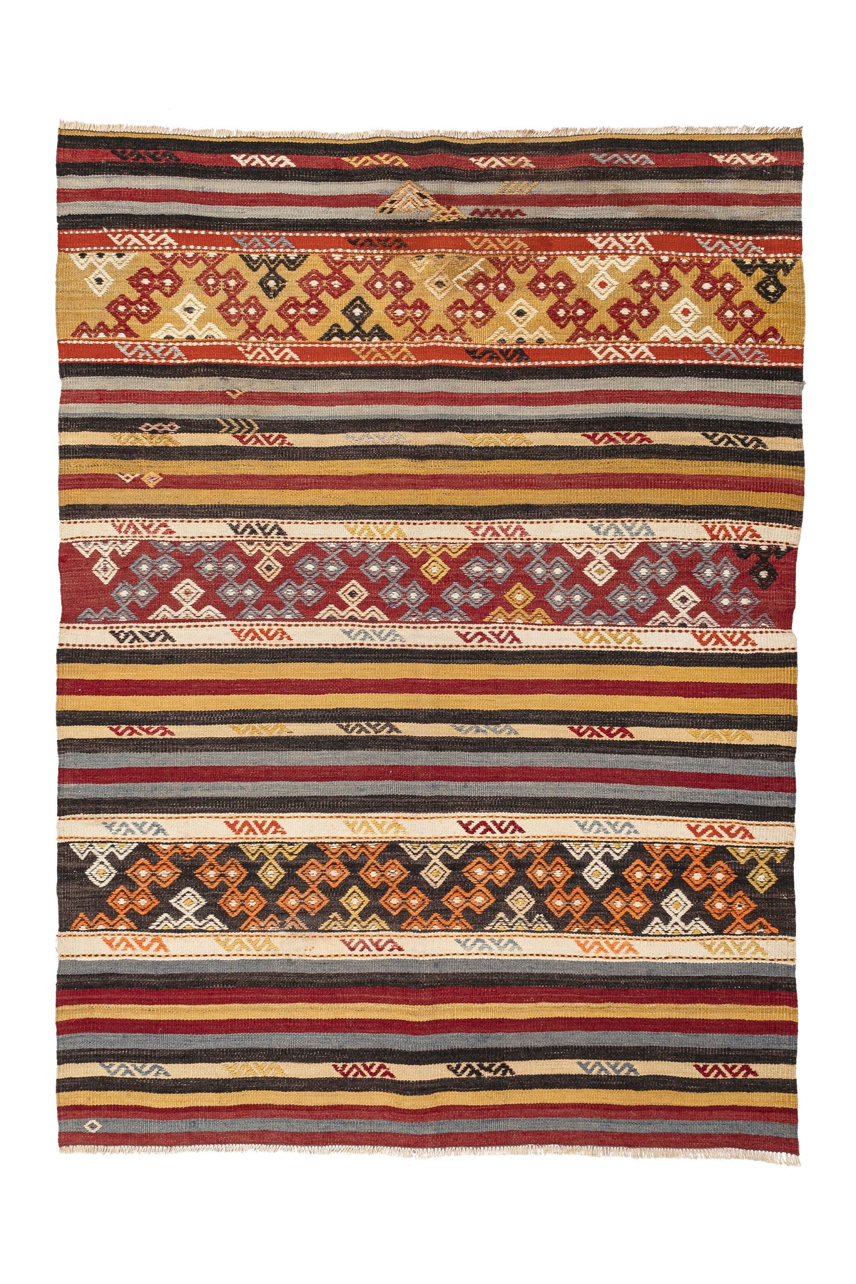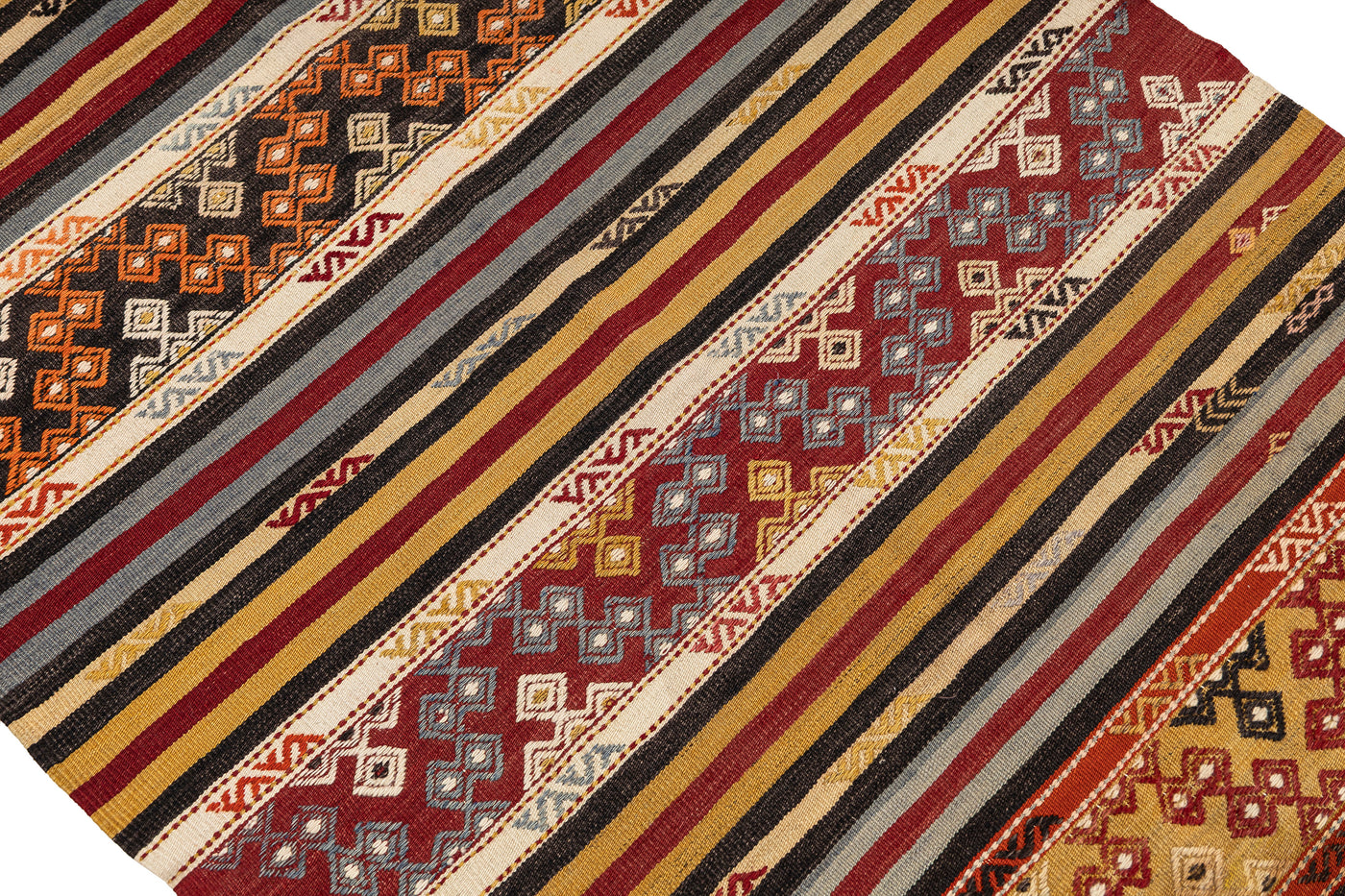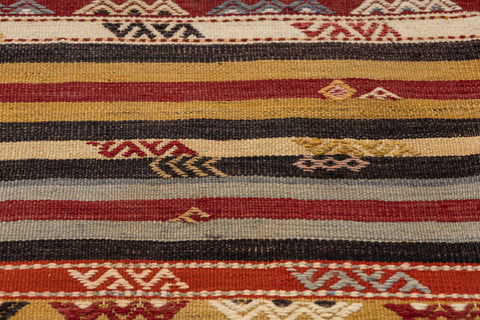 Turkish vintage kilims were made 100% wool on cotton or wool foundation by female artisans in Anatolian villages in the early and mid-20th Century.
