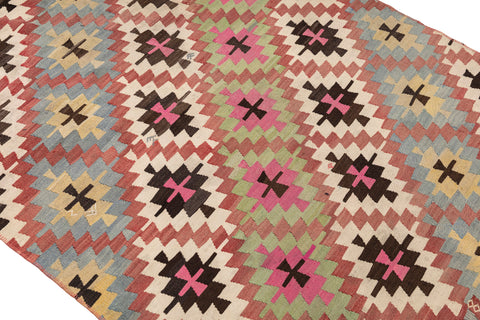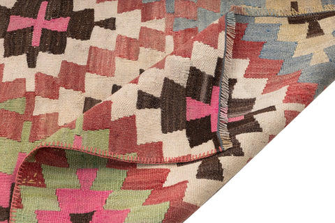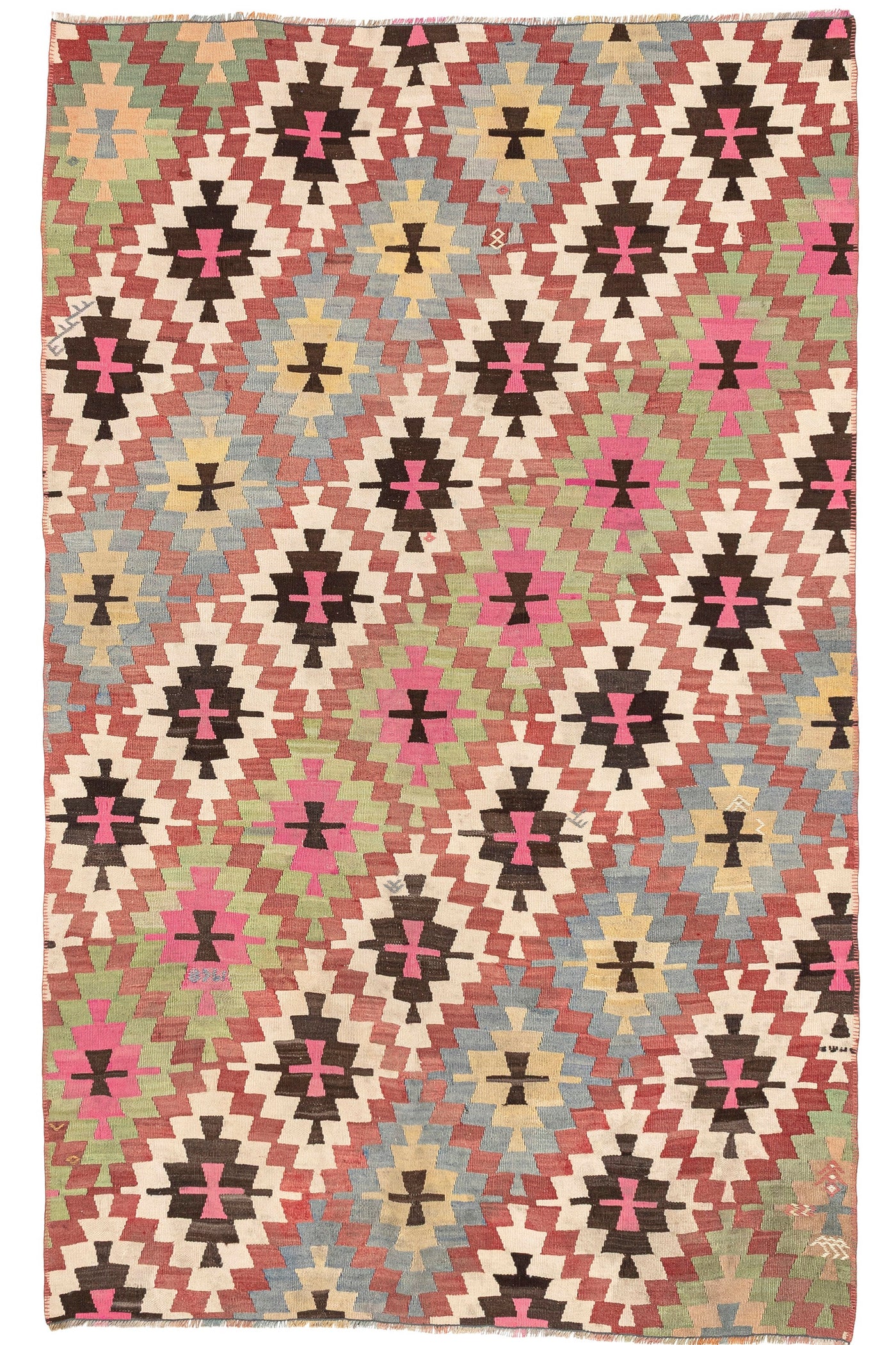 • Turkish vintage kilims were made 100% wool on cotton or wool foundation by female artisans in Anatolian villages in the early and mid-20th Century.