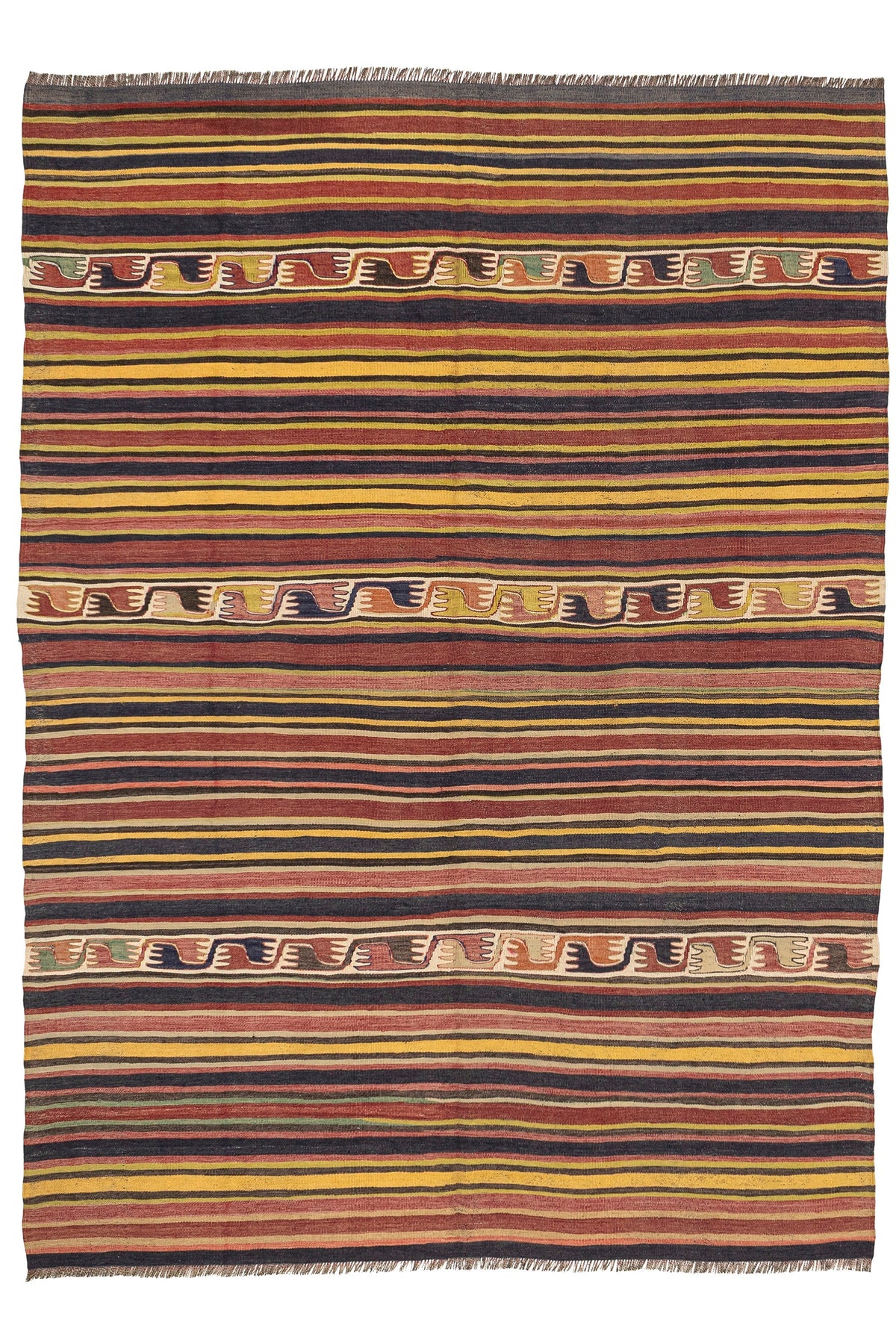 Turkish vintage kilims were made 100% wool on cotton or wool foundation by female artisans in Anatolian villages in the early and mid-20th Century.