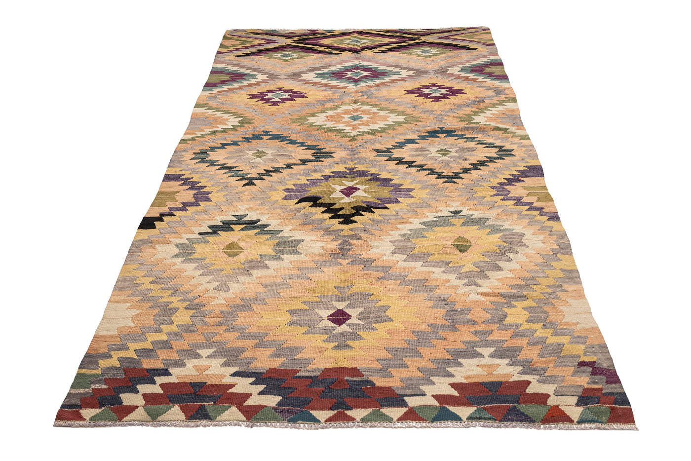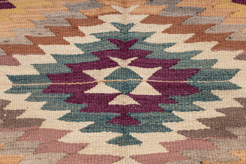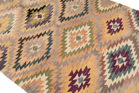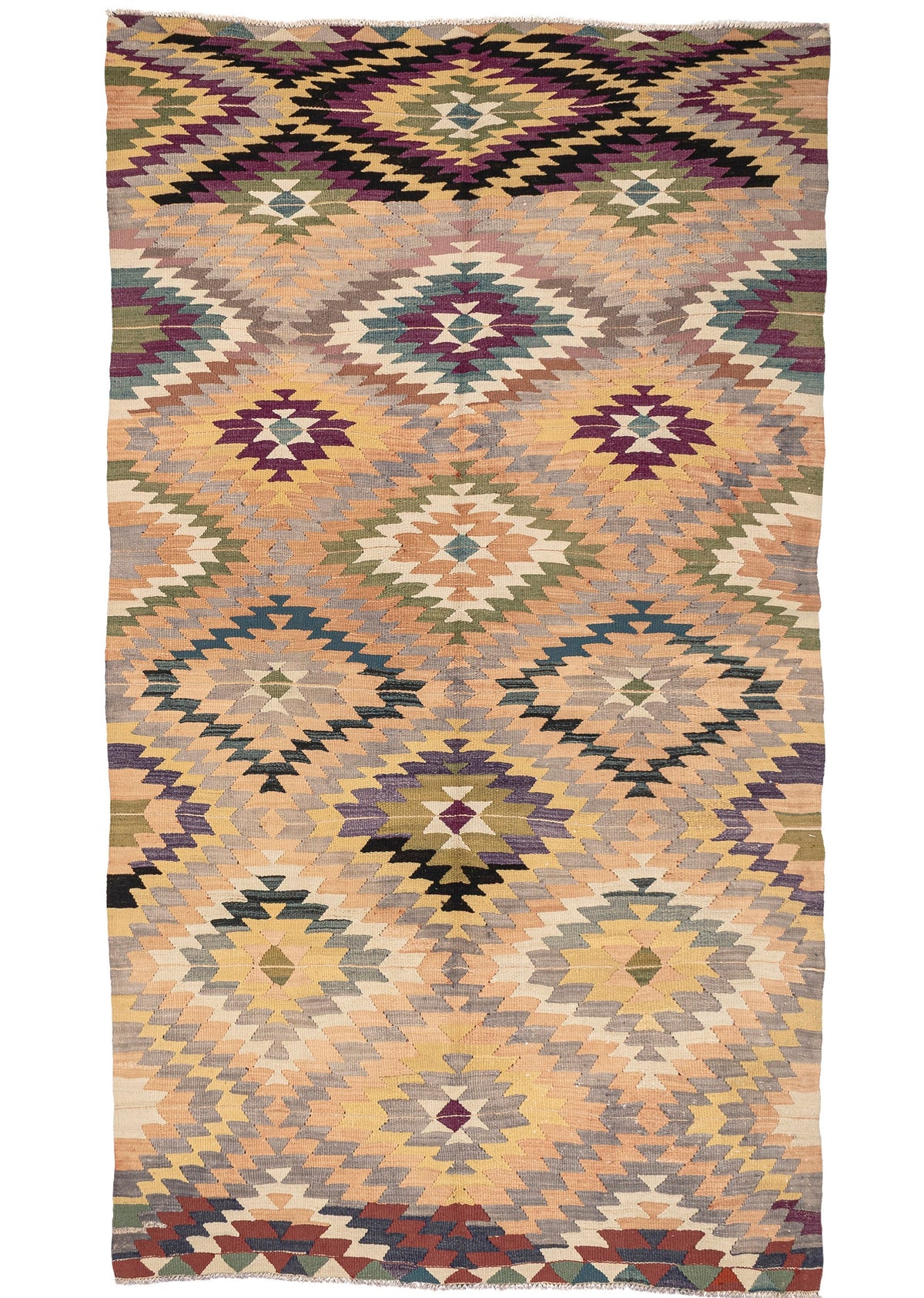 Turkish vintage kilims were made 100% wool on cotton or wool foundation by female artisans in Anatolian villages in the early and mid-20th Century.