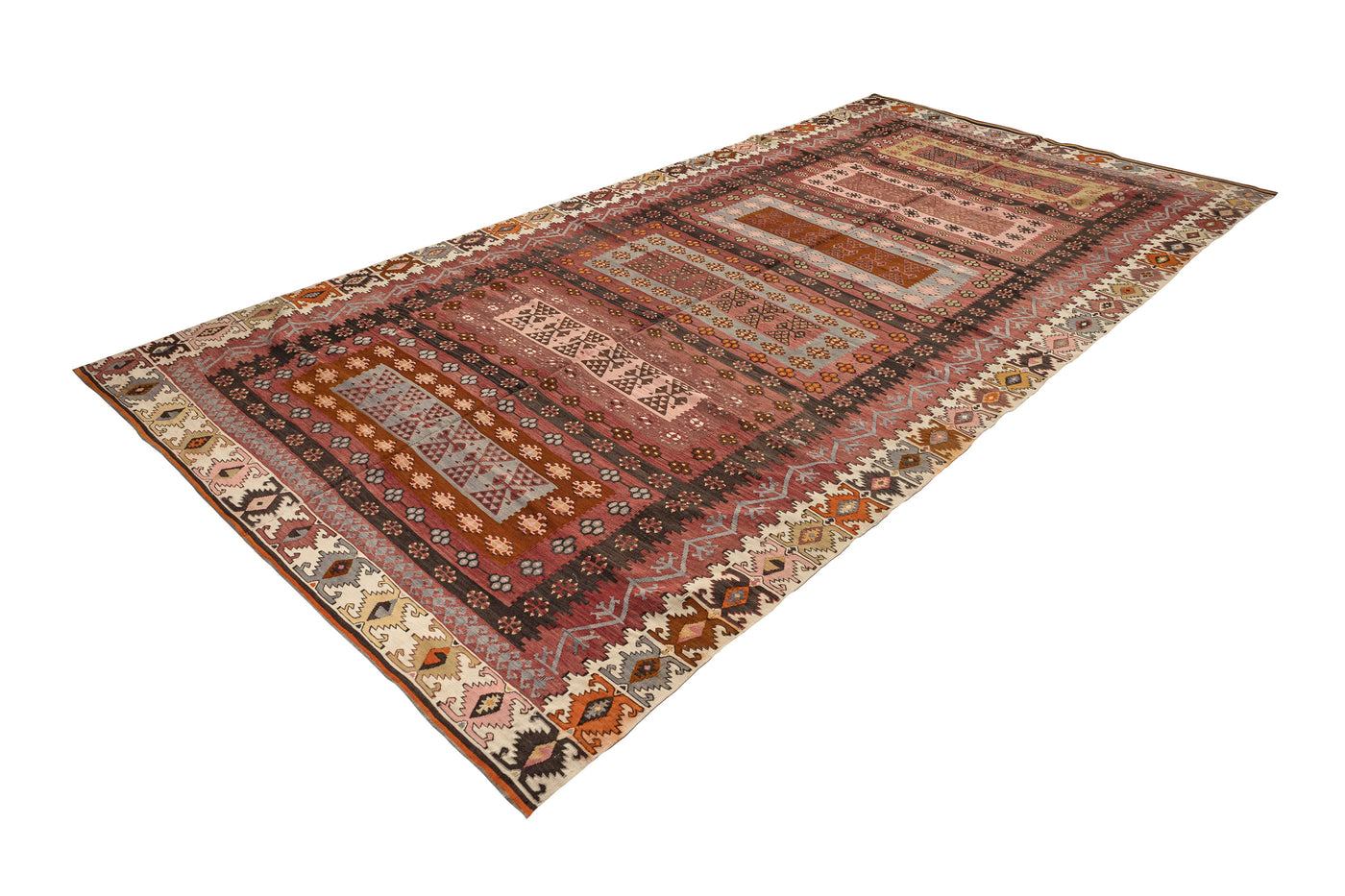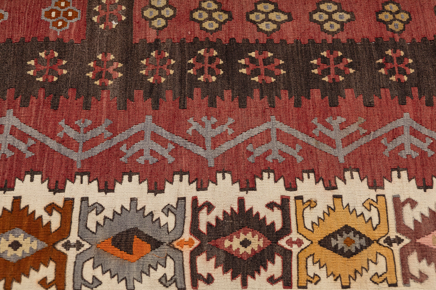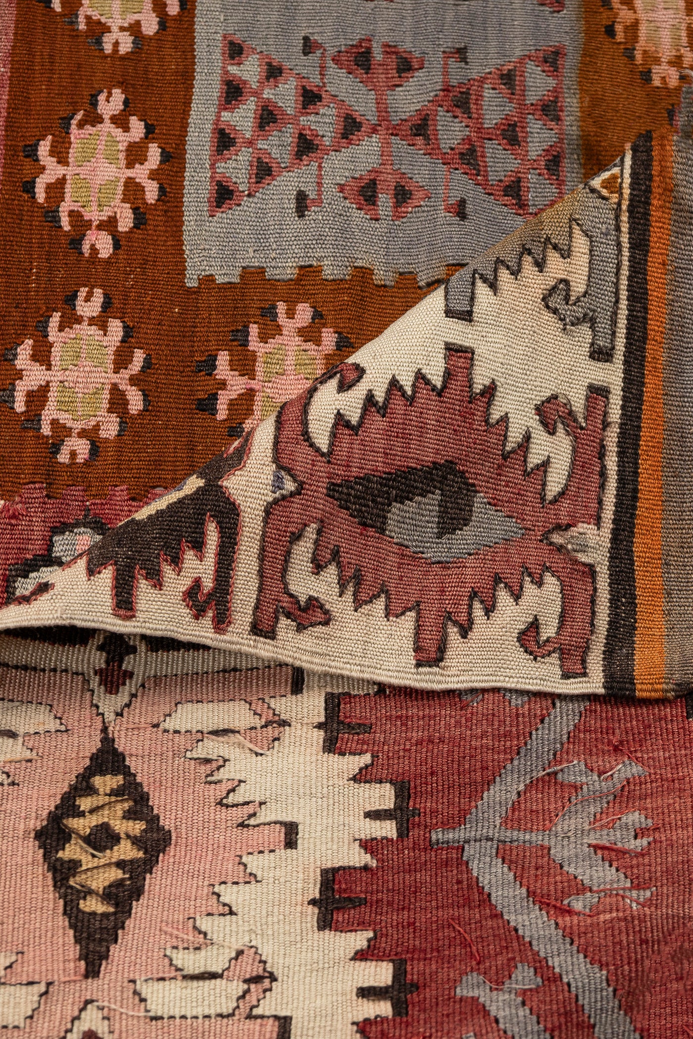 Turkish vintage kilims were made 100% wool on cotton or wool foundation by female artisans in Anatolian villages in the early and mid-20th Century.